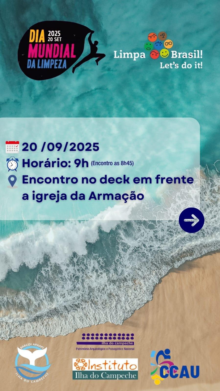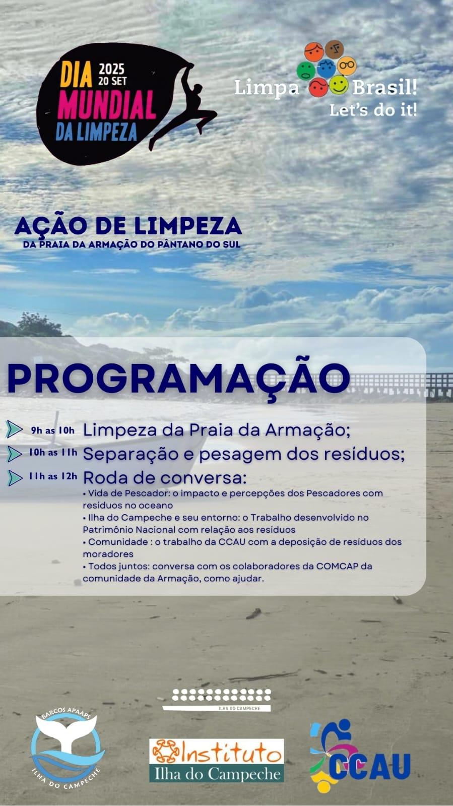 A atividade é promovida pelo Instituto Ilha do Campeche (IIC), por meio do GT Resíduos, e conta com o apoio da Associação de Pescadores da Armação do Pântano do Sul (APAAPS) e do Conselho Comunitário Armação Unida (CCAU). A ação é aberta a toda a comunidade e tem como objetivo reforçar a importância do cuidado com nosso litoral e a preservação dos oceanos e ambientes costeiros.