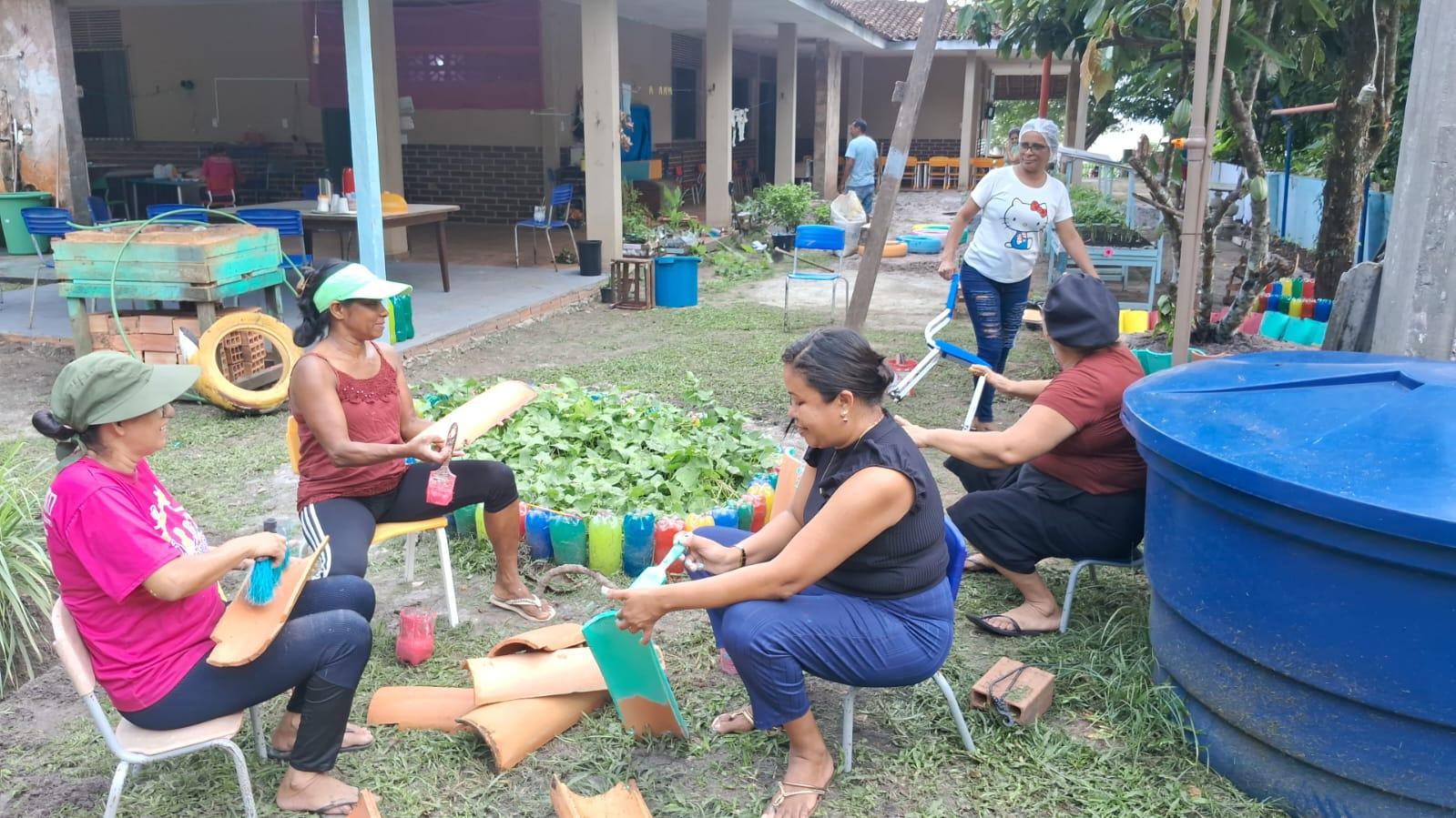 Ações de revitalização do espaço escolar, como pintura de murais nas paredes e piso.