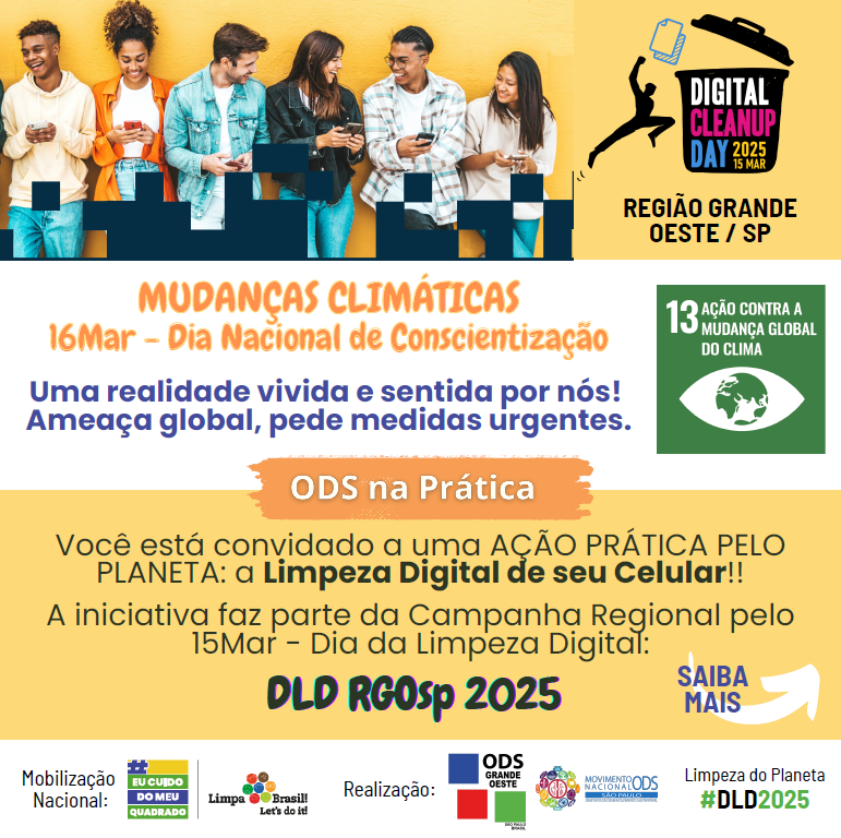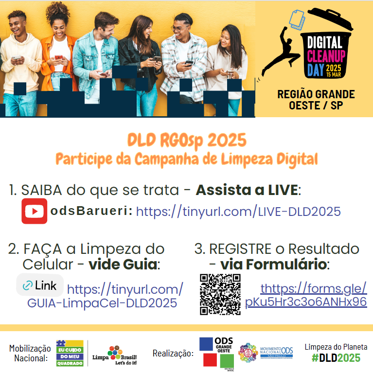 O Movimento ODS Grande Oeste de São Paulo (ODS-RGOsp) realiza a 2a edição da Campanha de Limpeza Digital - 15 à 23Mar2025. Repete campanha de Set/2024, por constatar que teve forte engajamento, em especial dos jovens.