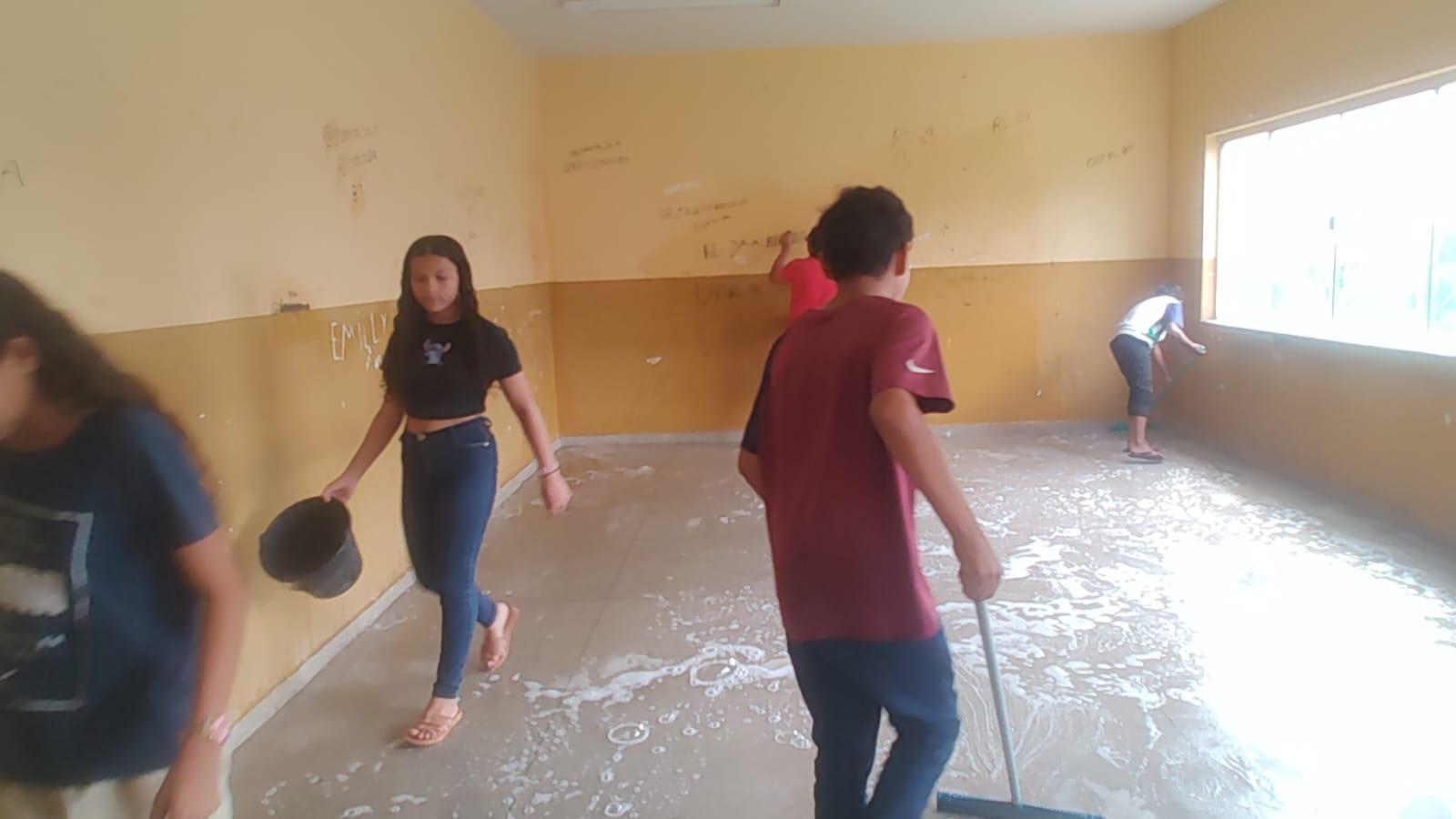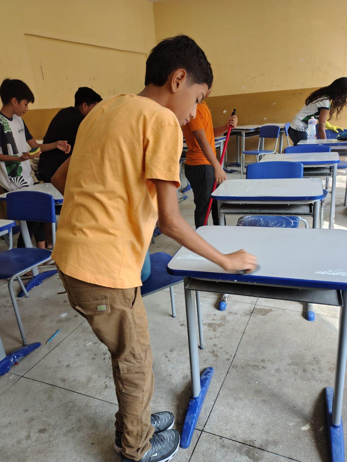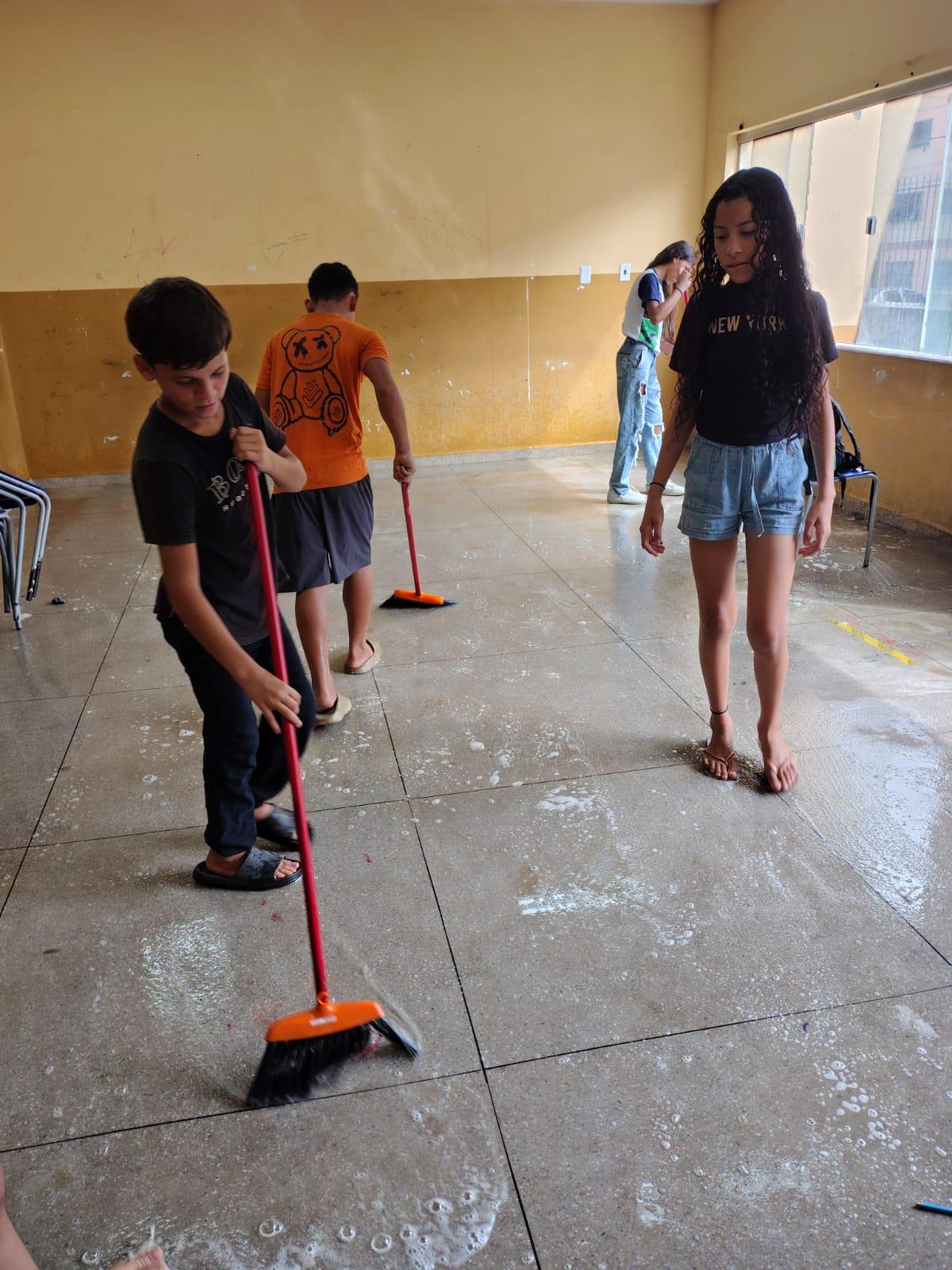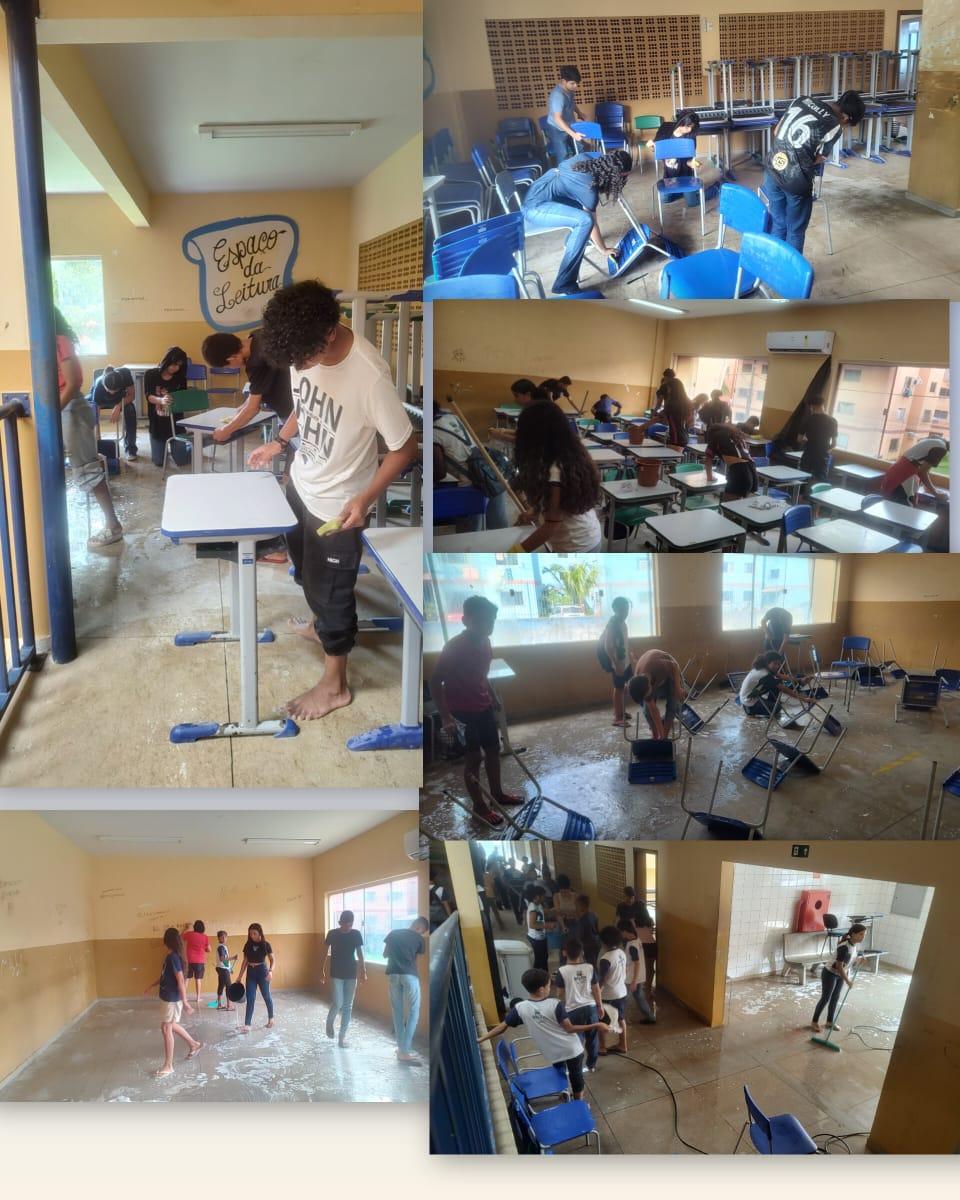 - Os alunos foram divididos em grupos de acordo com suas respectivas séries e salas de estudos. Para que, eles pudessem limpar esses ambientes. Assim, perceberam o quanto, embora sem intenção, eles não cuidam adequadamente de materiais como mesas e cadeiras, e principalmete do prédio o qual eles passam parte do dia deles.