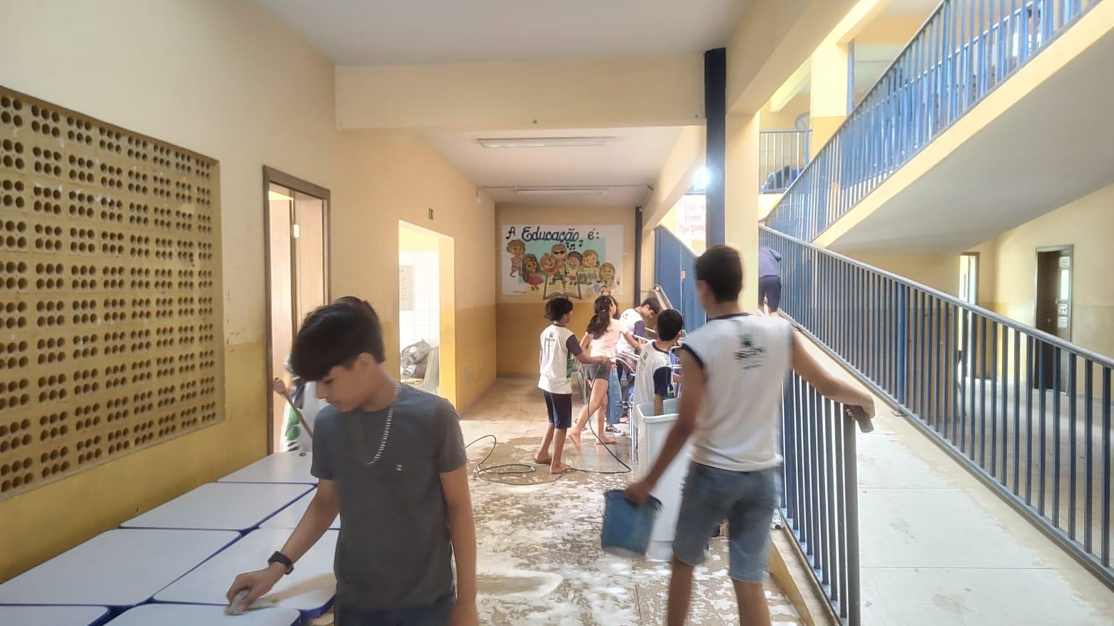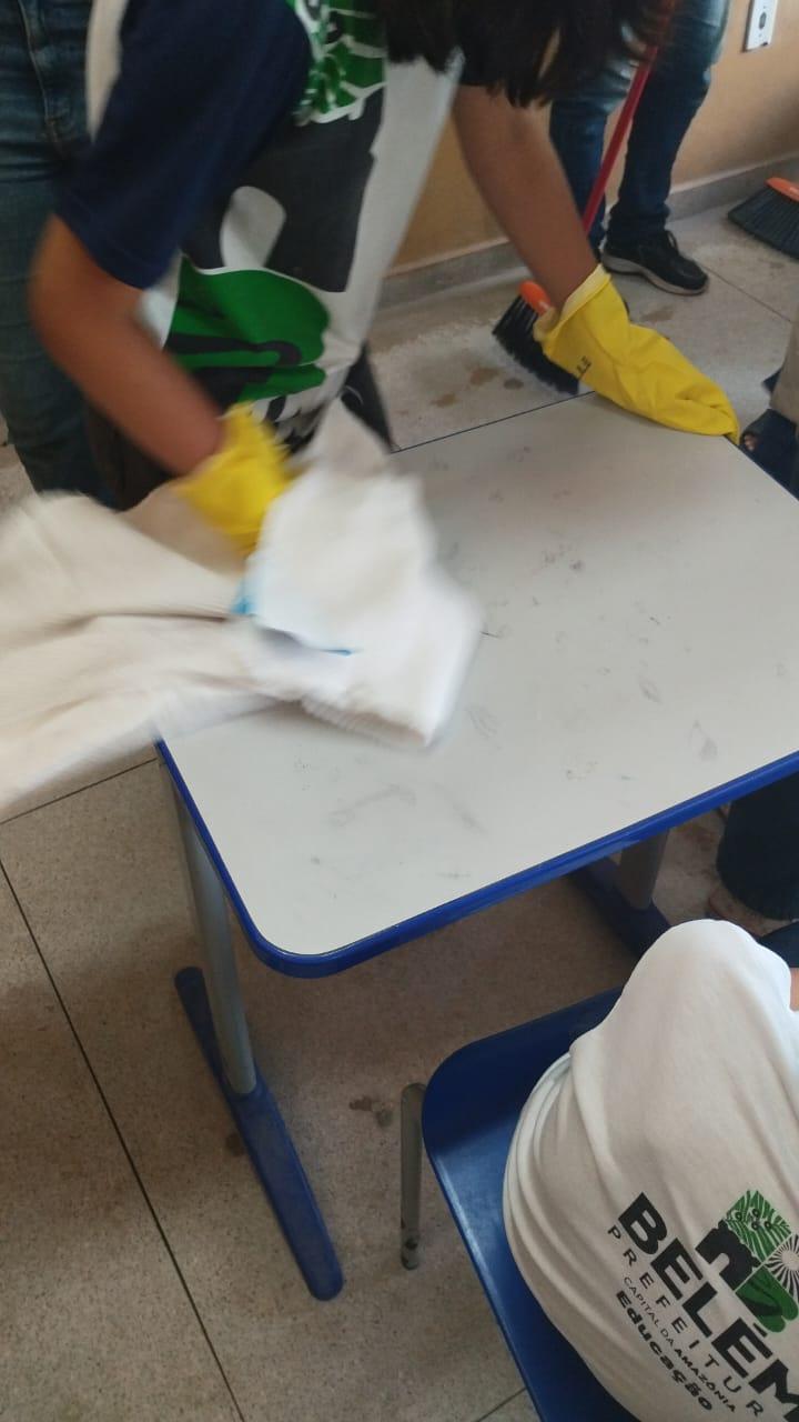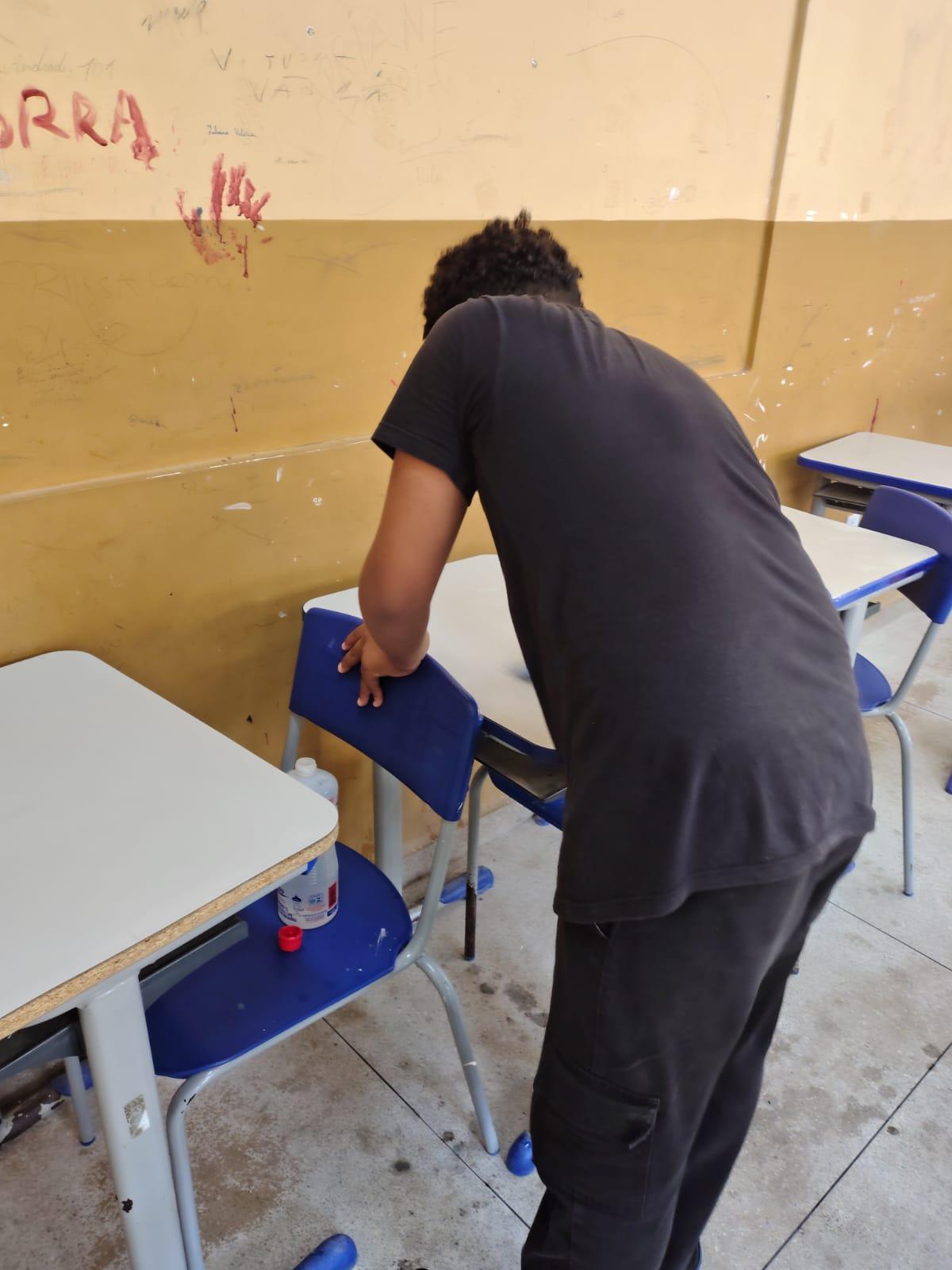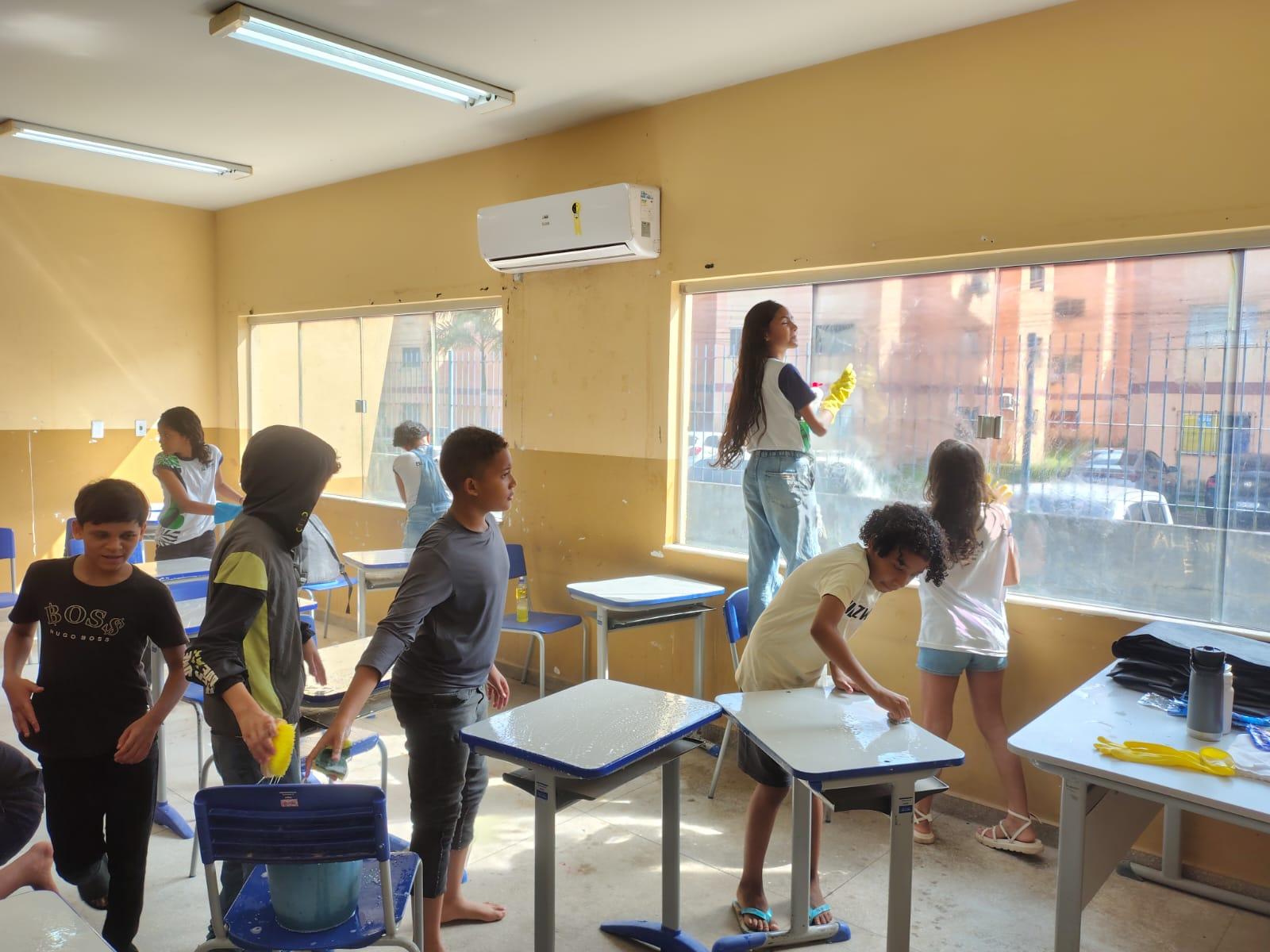 - Os alunos foram divididos em grupos de acordo com suas respectivas séries e salas de estudos. Para que, eles pudessem limpar esses ambientes. Assim, perceberam o quanto, embora sem intenção, eles não cuidam adequadamente de materiais como mesas e cadeiras, e principalmete do prédio o qual eles passam parte do dia deles.