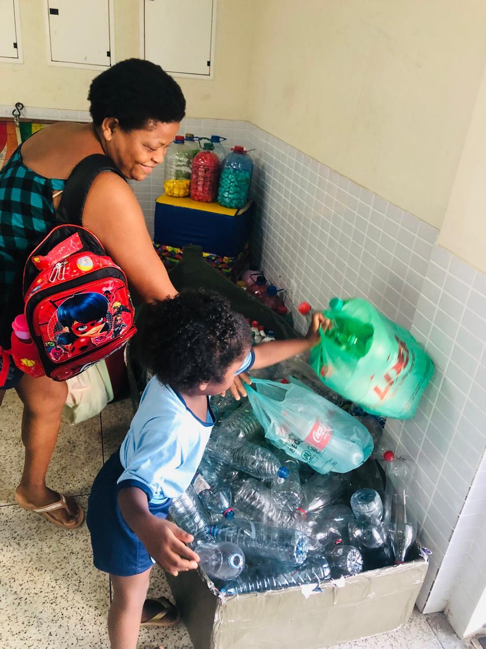 - Oficina de Ecotijolos, ensinando a construção de tijolos ecológicos a partir de garrafas PET e plásticos não recicláveis. Esses ecotijolos serão utilizados na construção coletiva de uma casinha de brinquedo e puffs, que ficará disponível para o uso das crianças no espaço escolar.