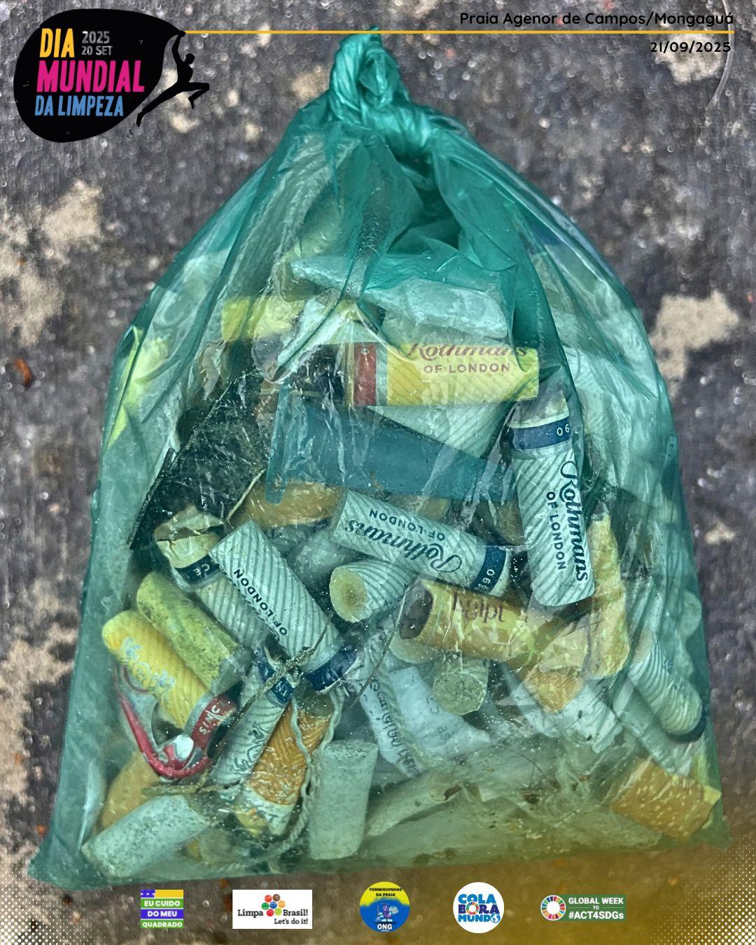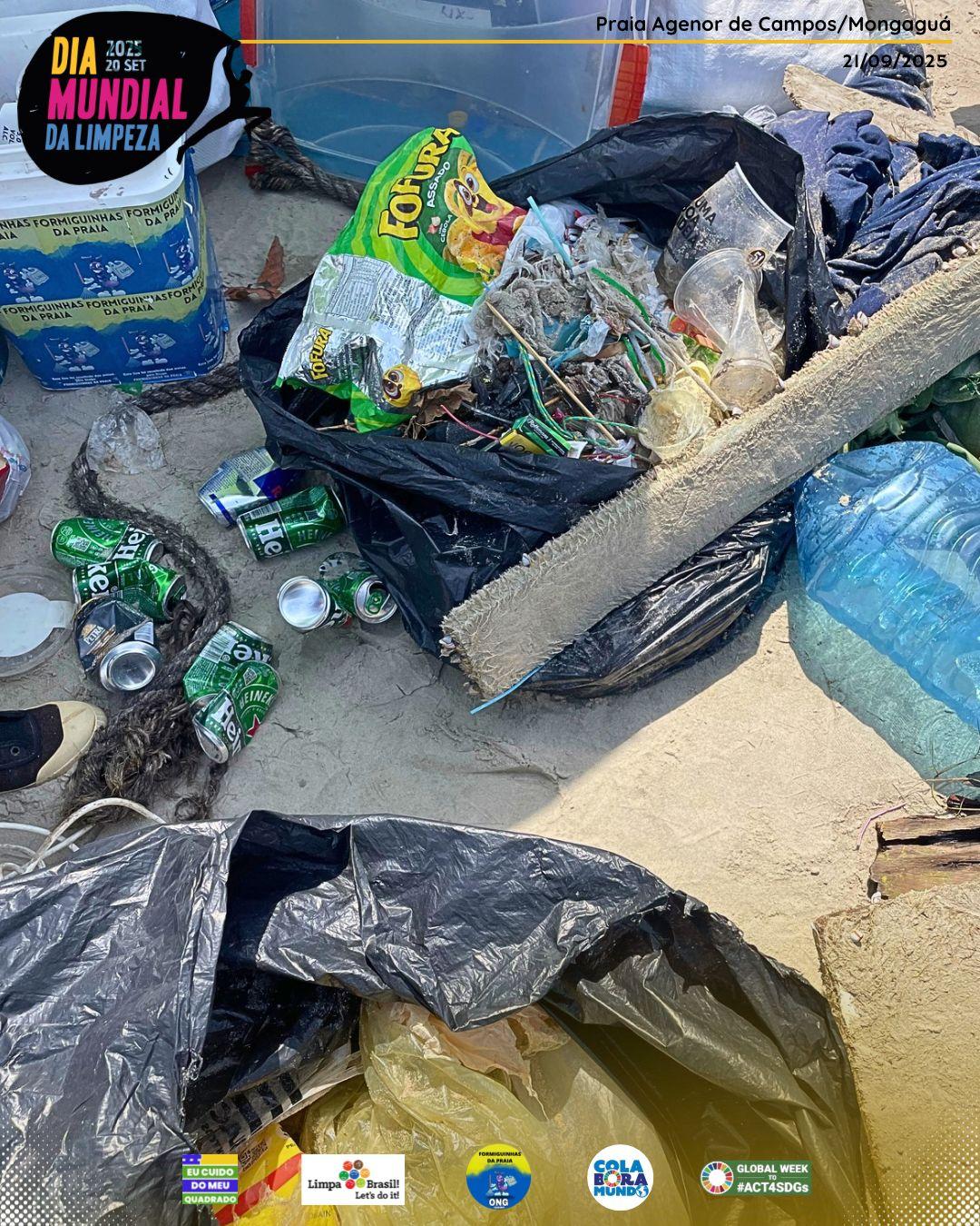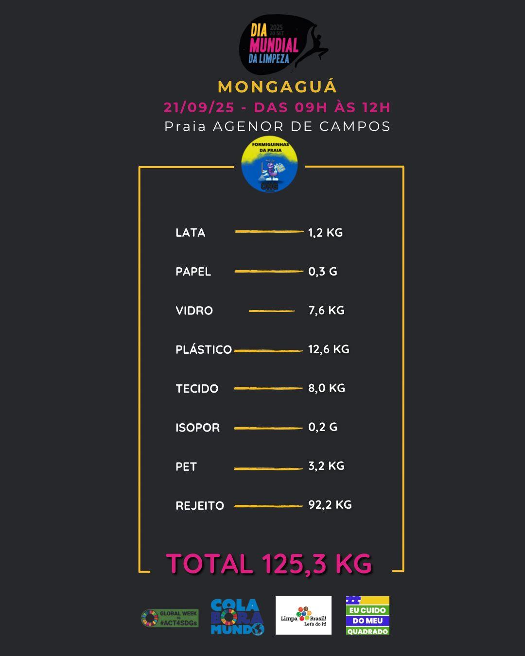 Papel - 0,3kg; Plásticos – 12,6kg; Tecidos – 8kg; isopor – 0,2kg; latas – 1,2kg; PET – 3,2kg; Vidro – 7,6kg; Rejeitos – 20kg.