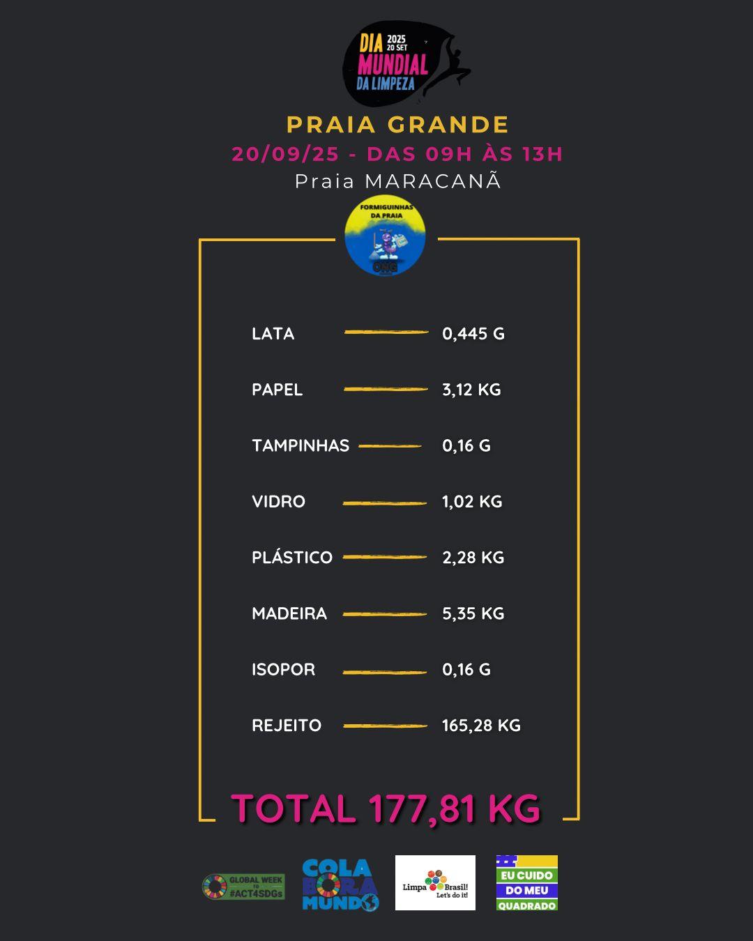 Latas 0,445kg; Papel – 3,12kg; Plásticos – 2,28kg; Tampinha – 0,160kg; Madeira 5,35kg; Vidro – 1,02kg; Isopor – 0,16kg; Rejeito – 165,28kg.