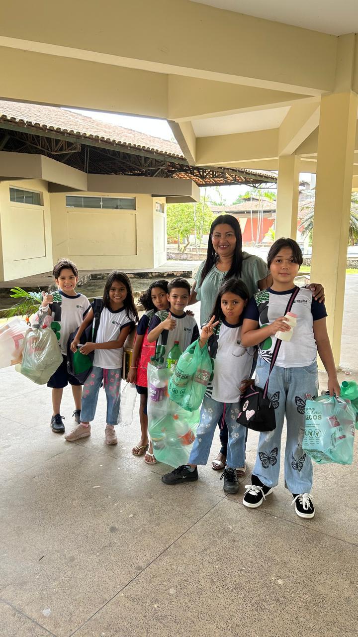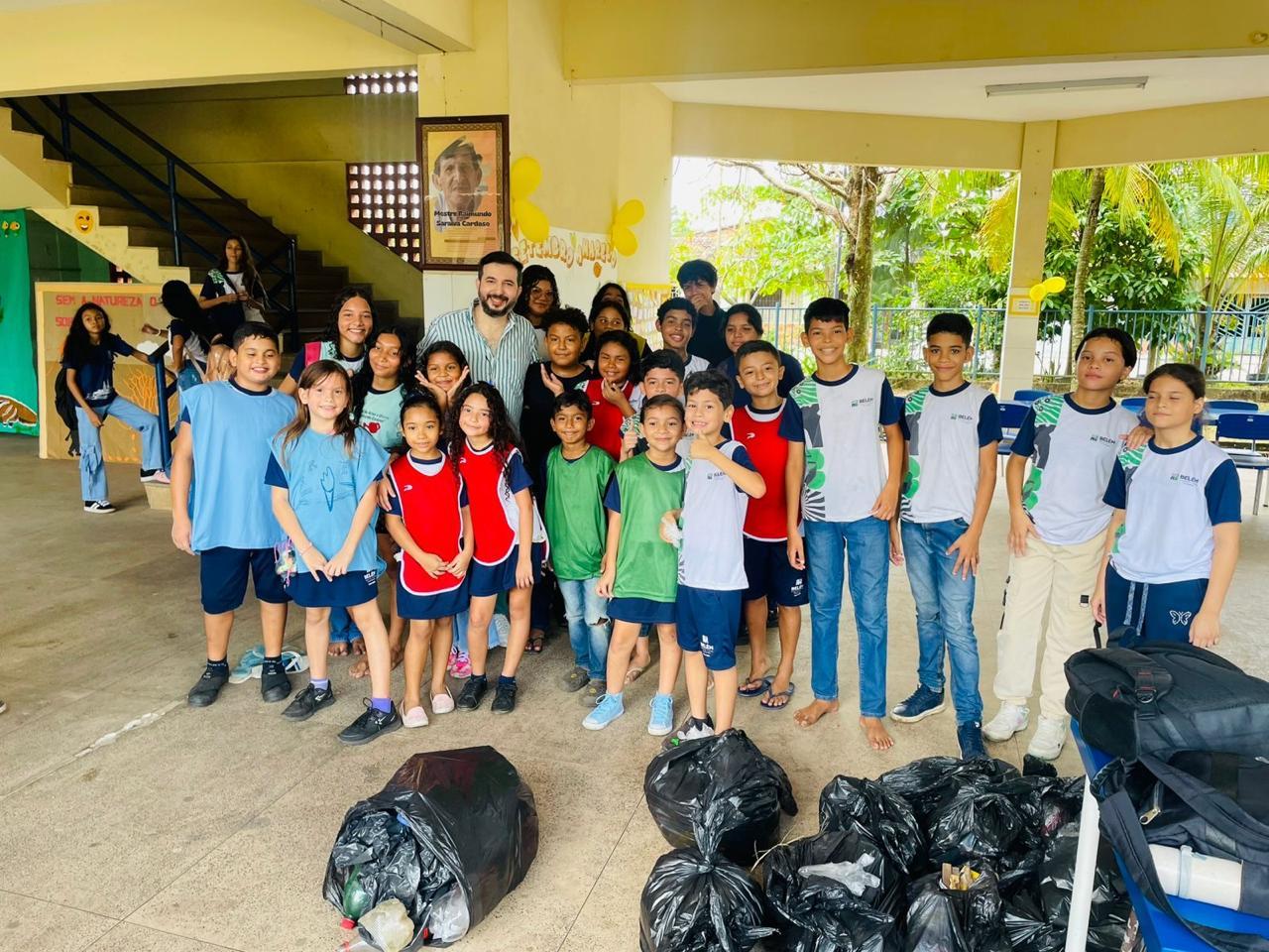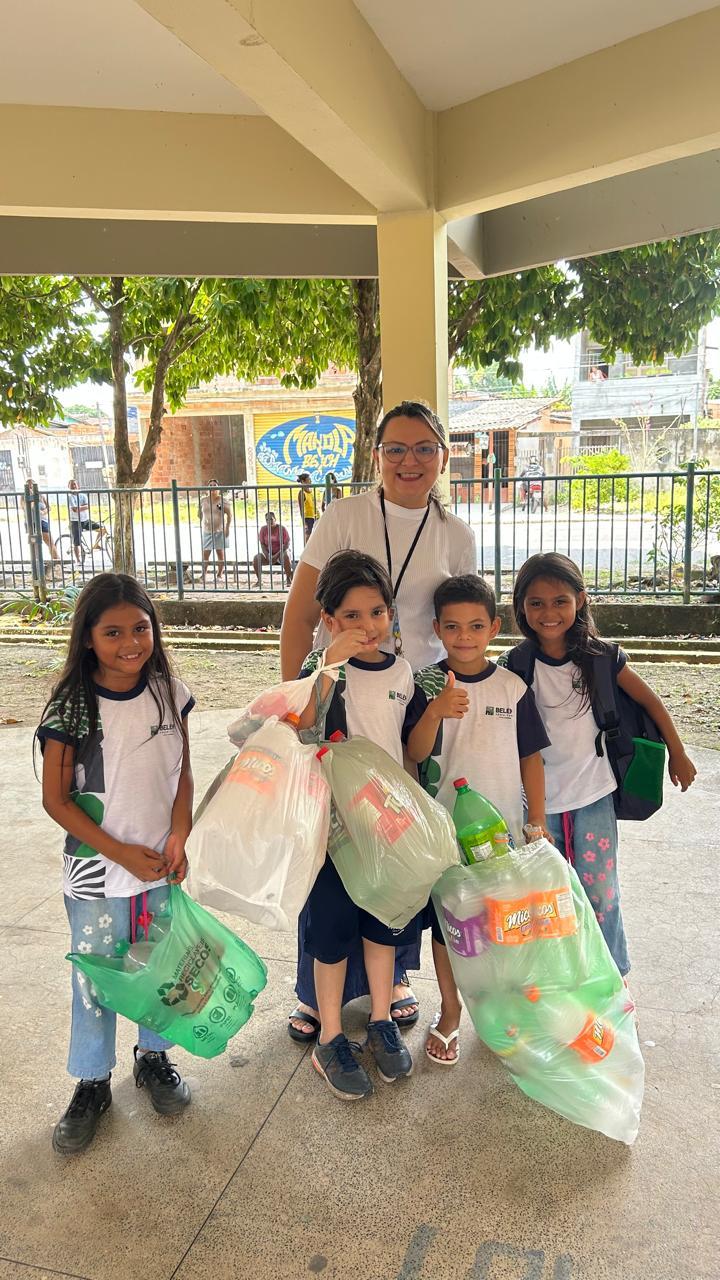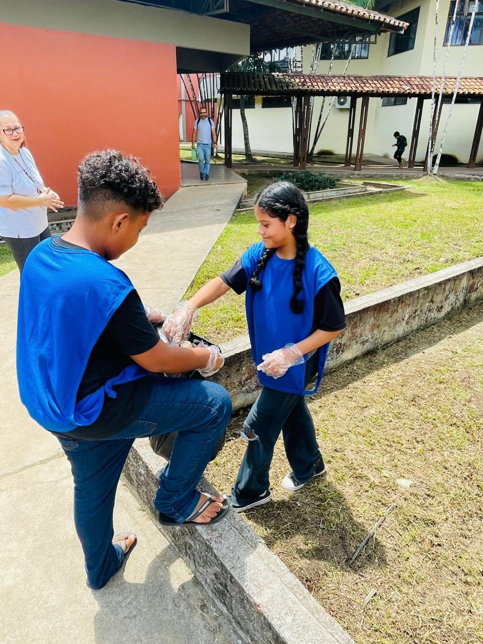 Coleta de recicláveis no pátio escolar.