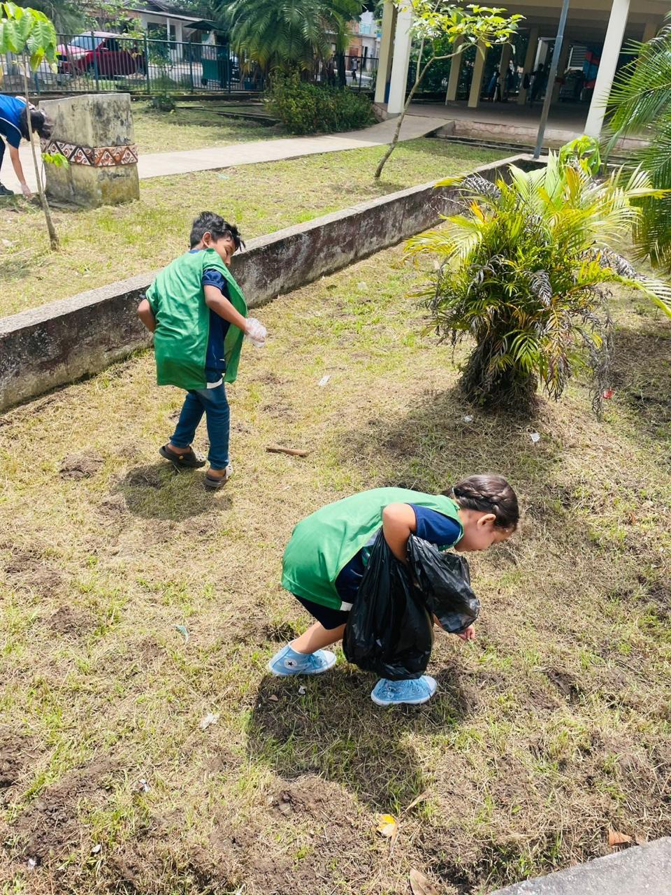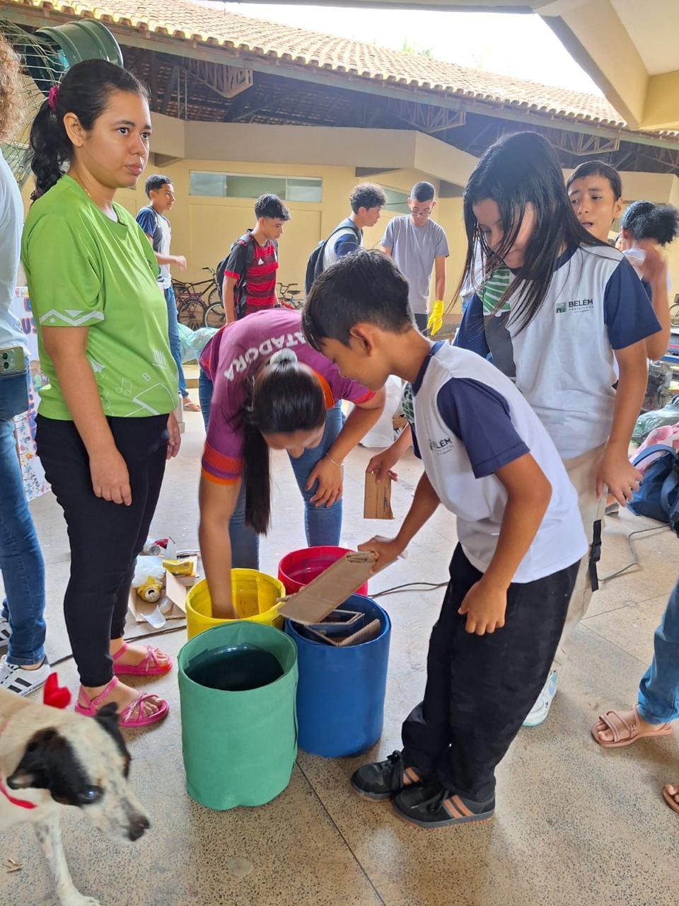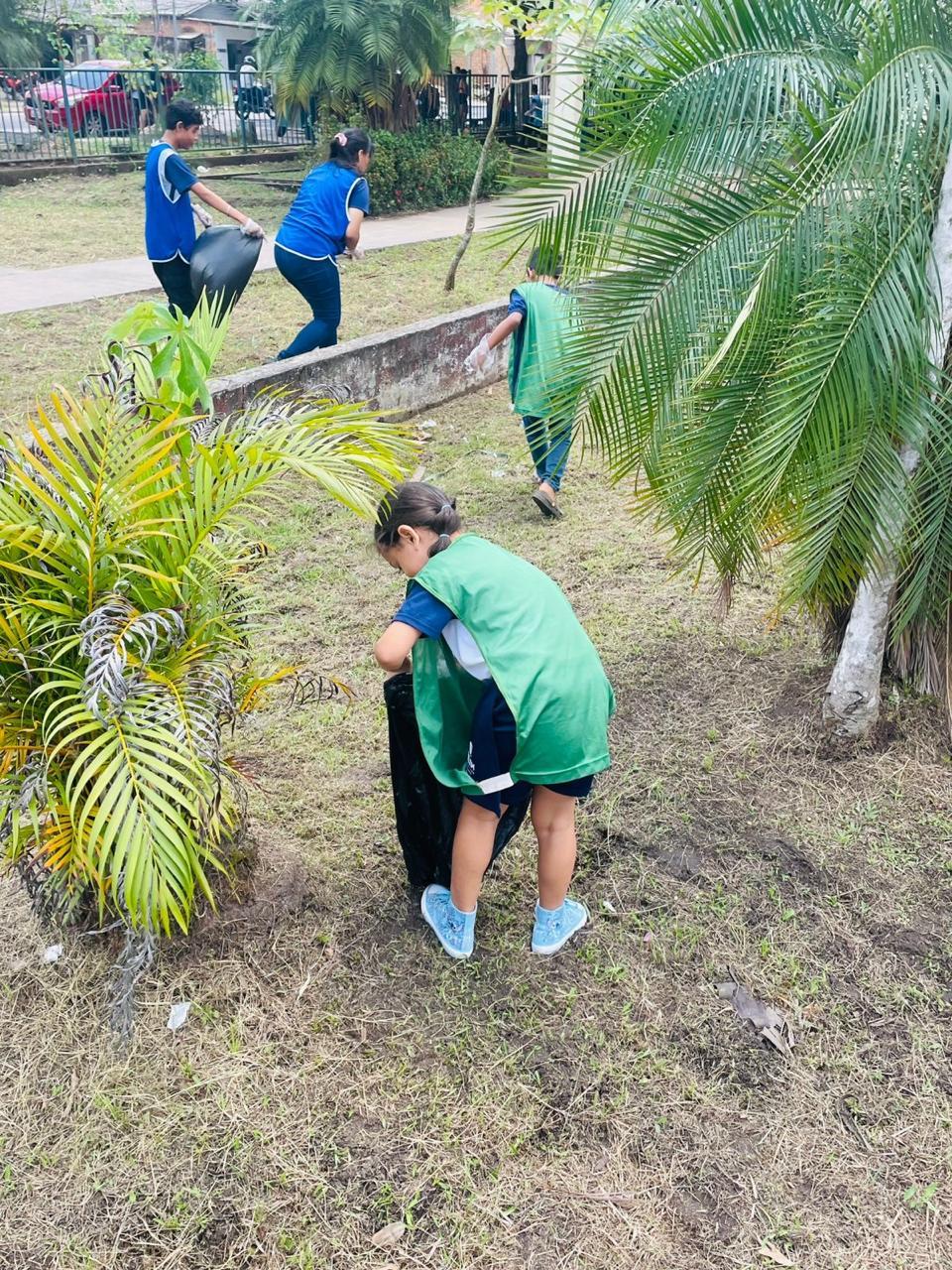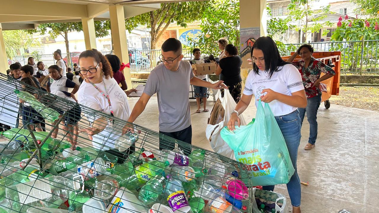 Coleta de recicláveis no pátio escolar.