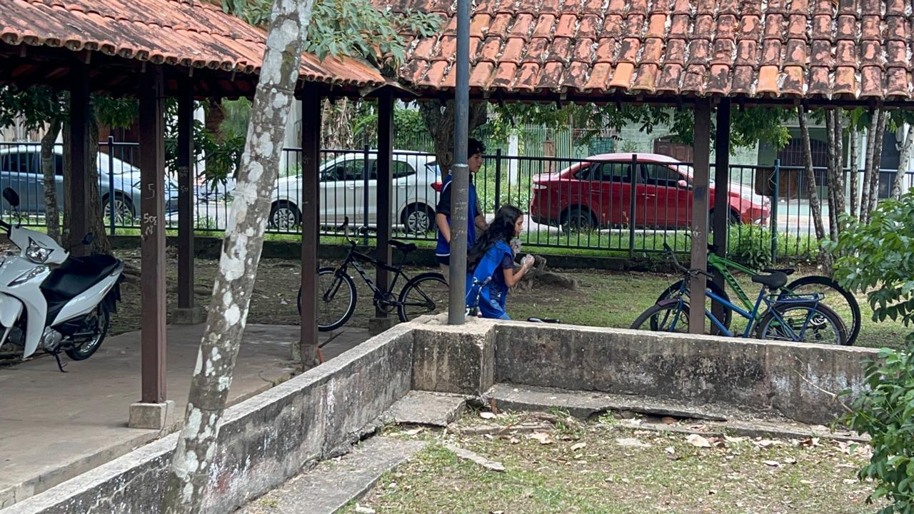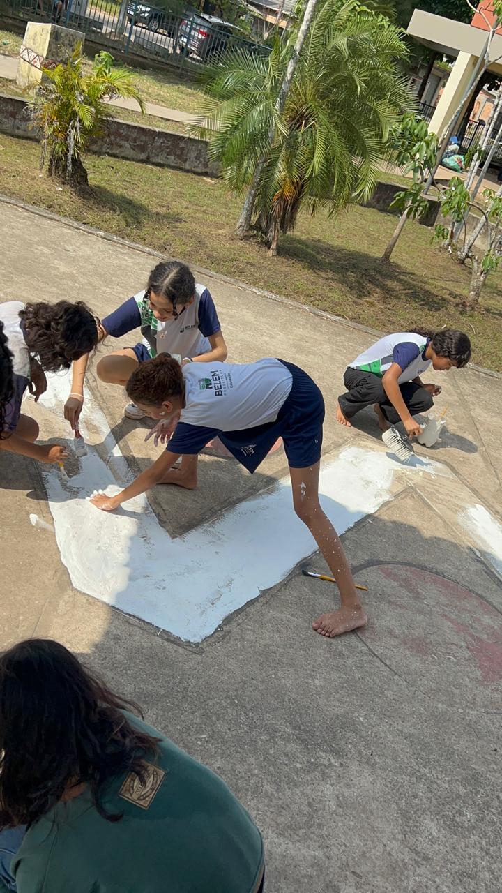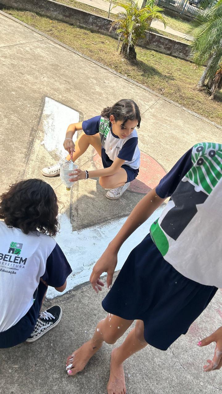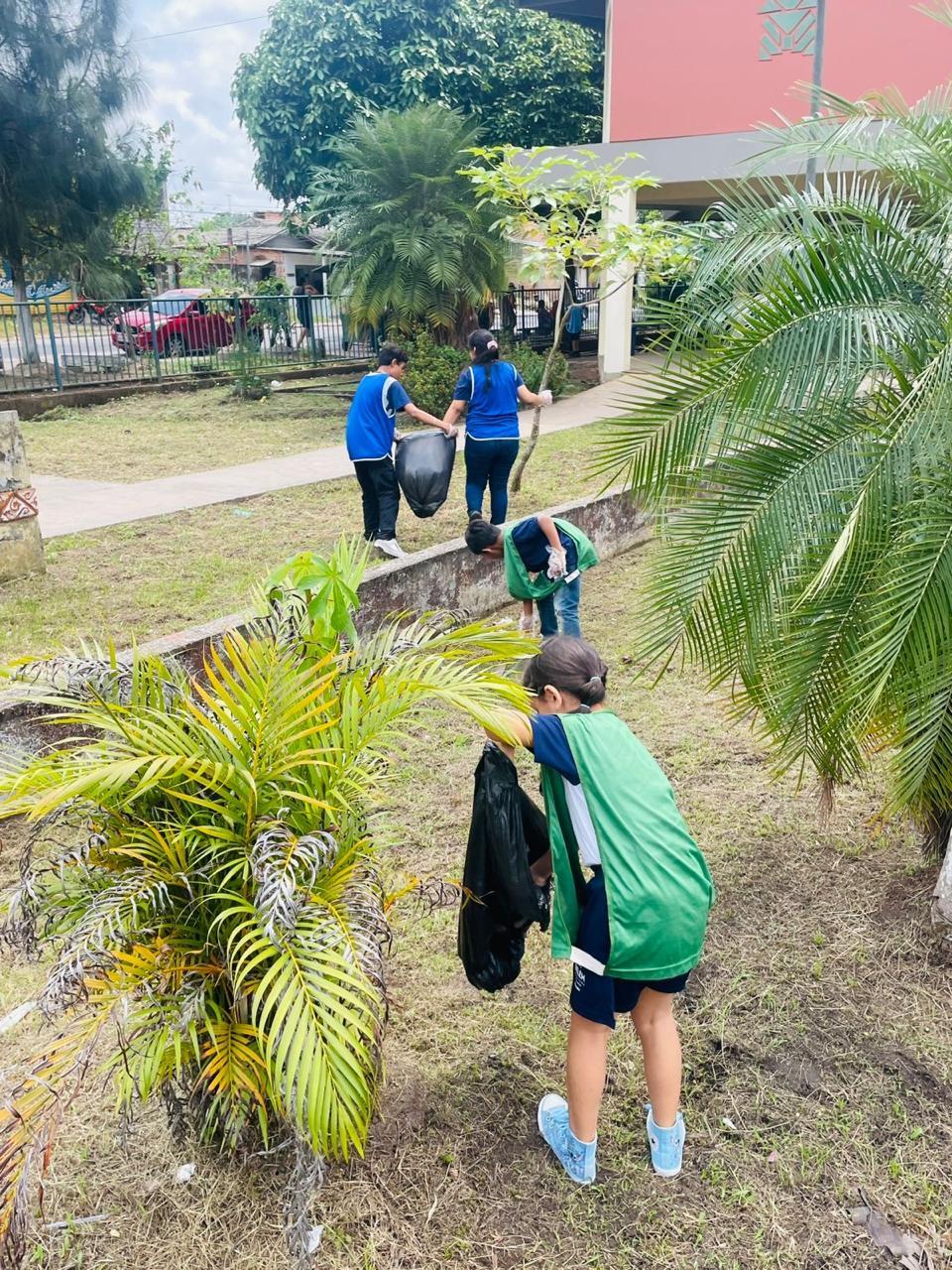 Coleta de recicláveis no pátio escolar.