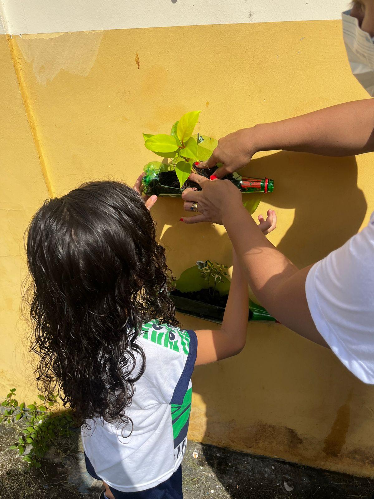 - Plantio de árvores no pátio aberto da escola e o plantio de hortaliças nos canteiros suspensos;