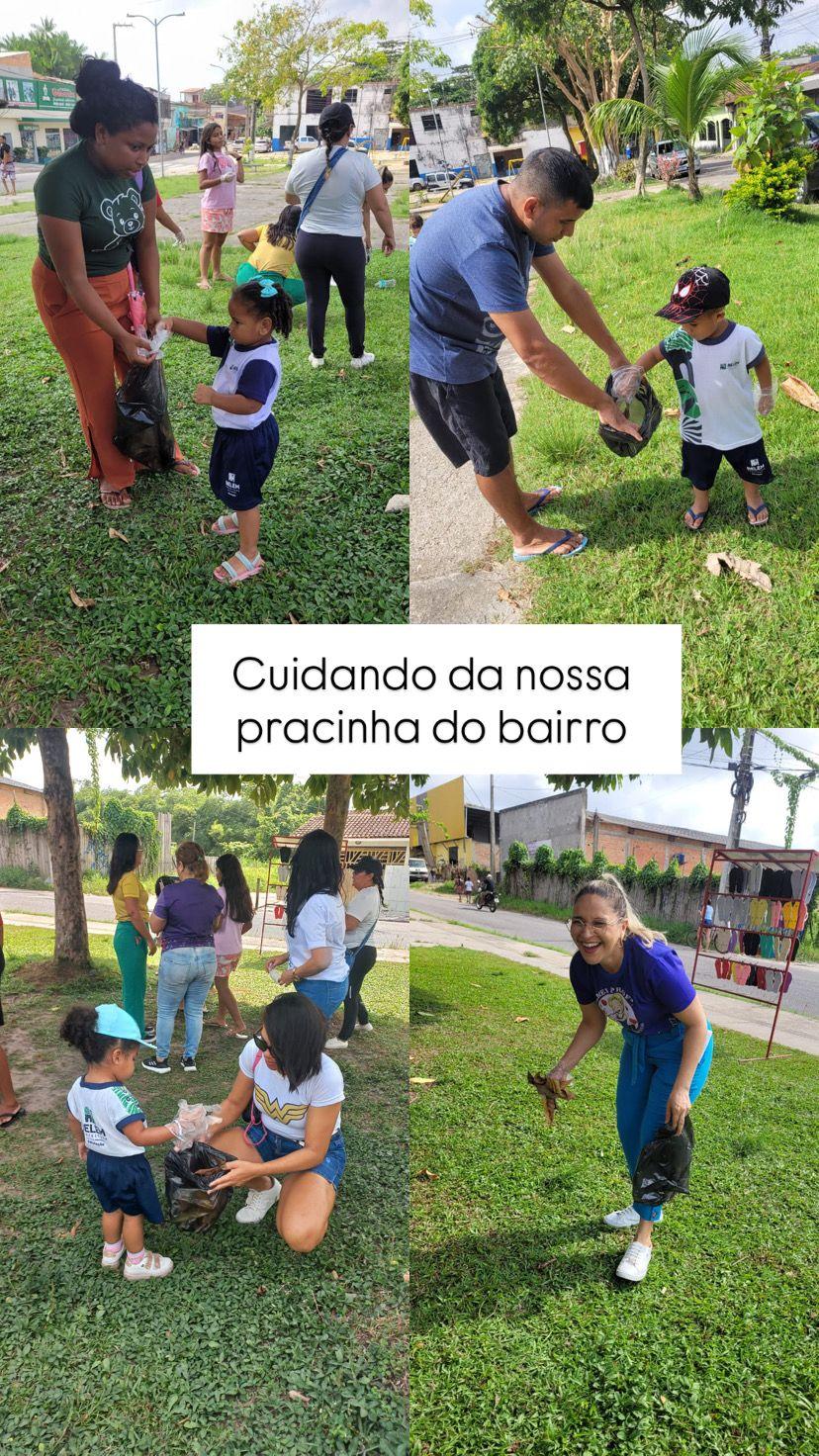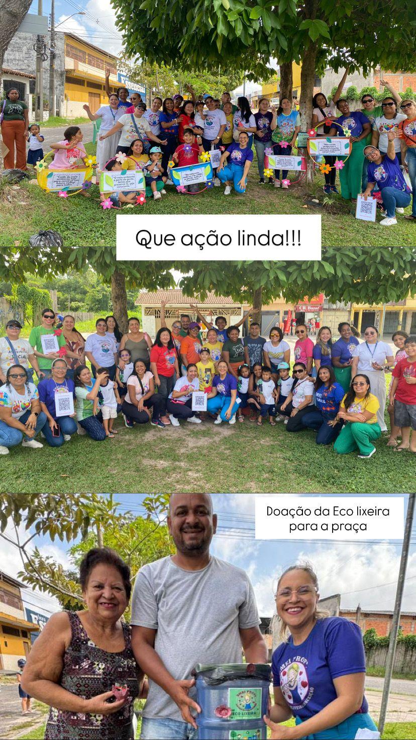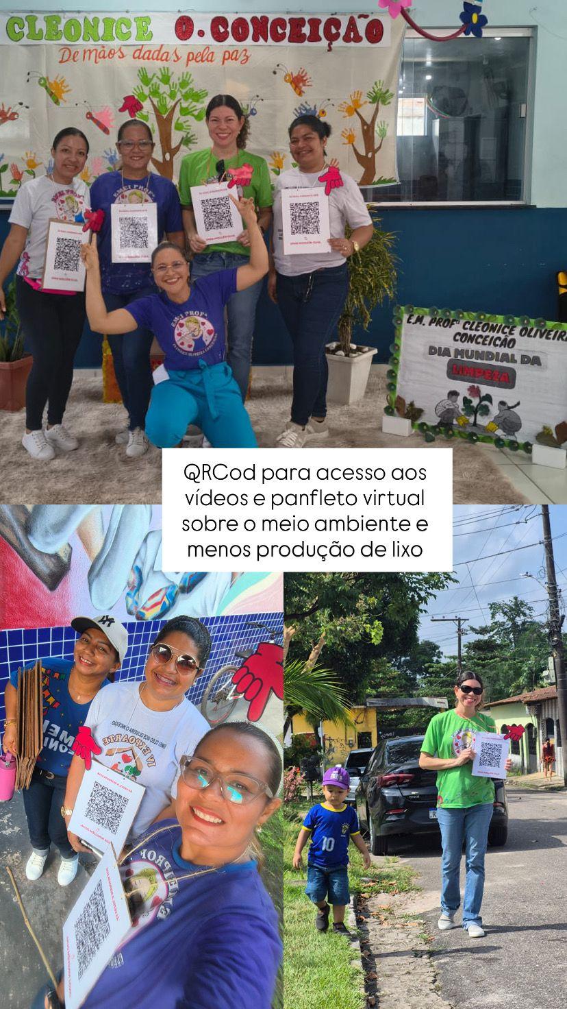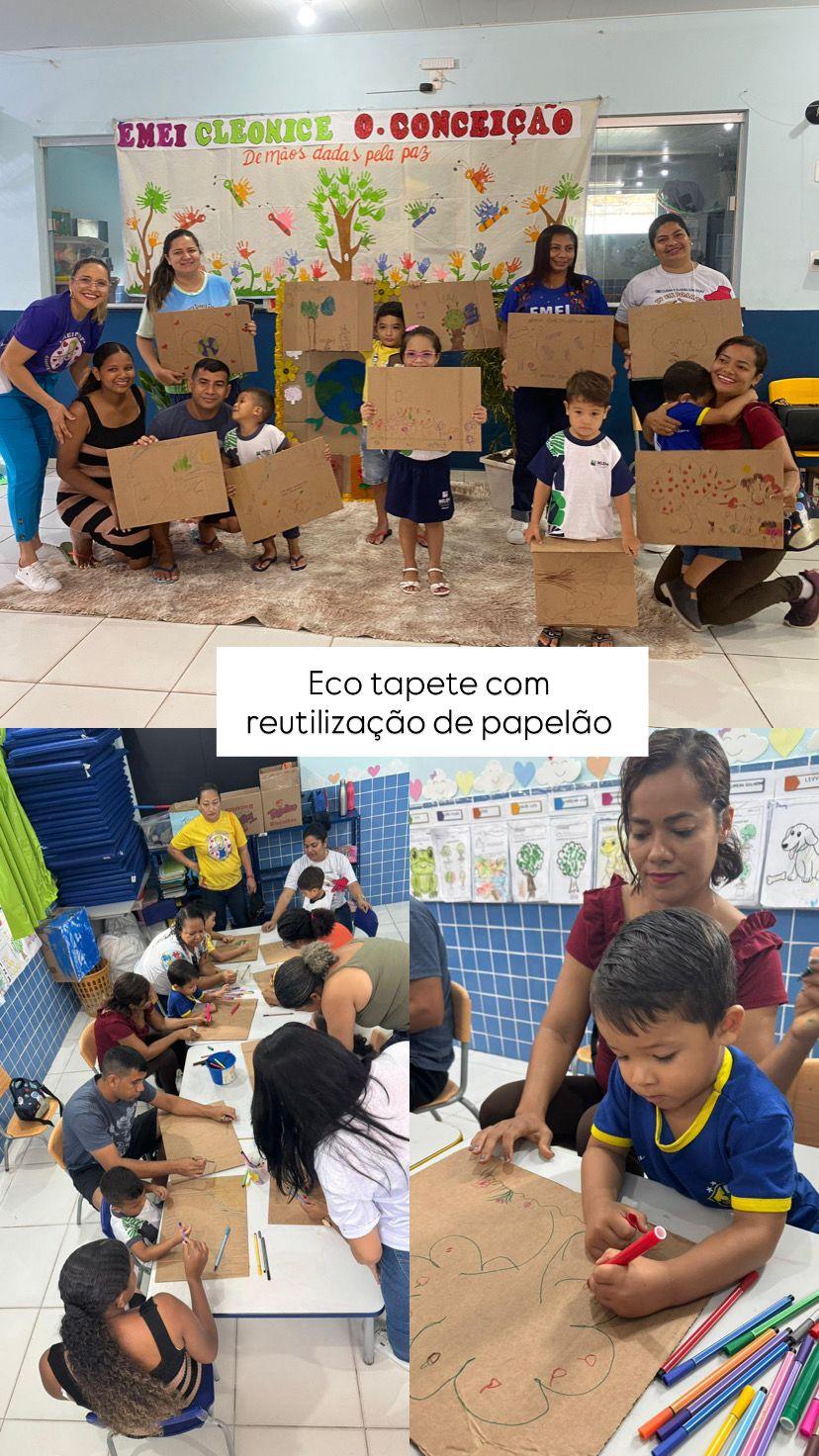 Em seguida, foram confeccionadas ecolixeiras e tapetes ecológicos, produzidos de forma coletiva pelas crianças e seus familiares em sala de aula. Após a produção, partimos em uma caminhada ecológica pelo bairro em direção à Praça Jhon Deon, levando faixas ilustrativas e QR Codes com informações sobre preservação ambiental, de forma a evitar o desperdício de papel.