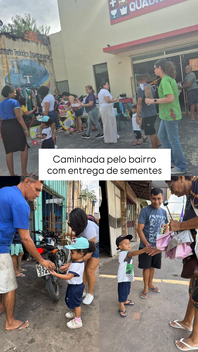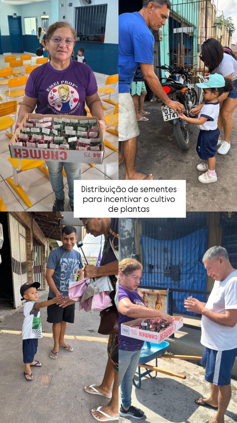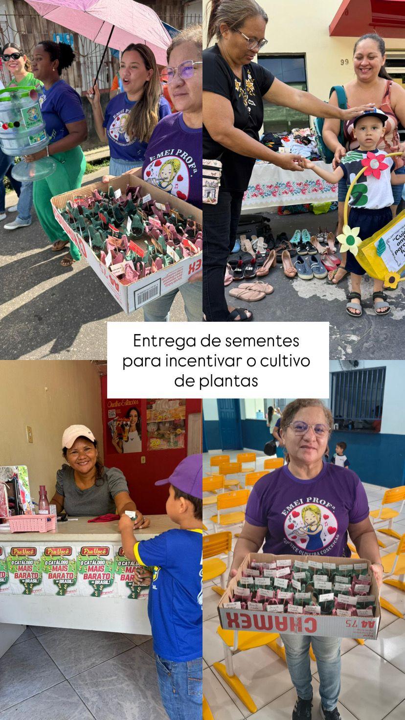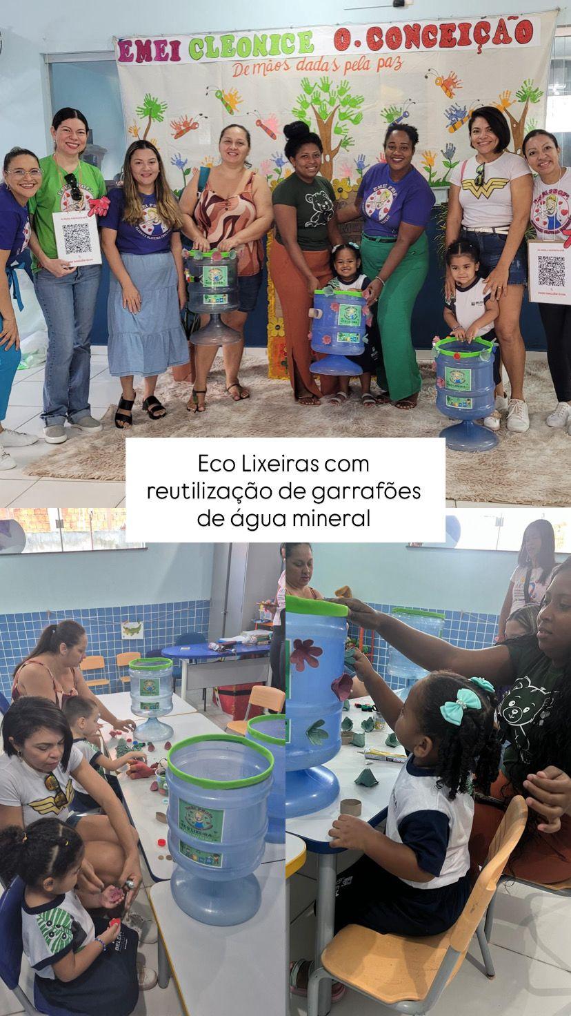 Em seguida, foram confeccionadas ecolixeiras e tapetes ecológicos, produzidos de forma coletiva pelas crianças e seus familiares em sala de aula. Após a produção, partimos em uma caminhada ecológica pelo bairro em direção à Praça Jhon Deon, levando faixas ilustrativas e QR Codes com informações sobre preservação ambiental, de forma a evitar o desperdício de papel.