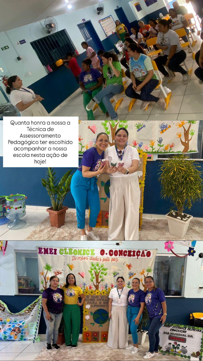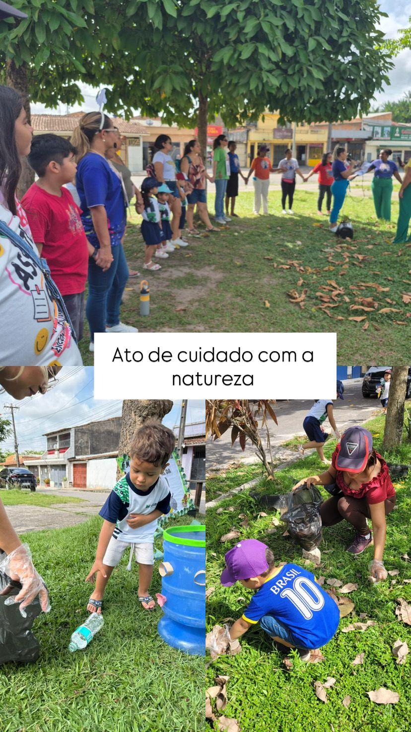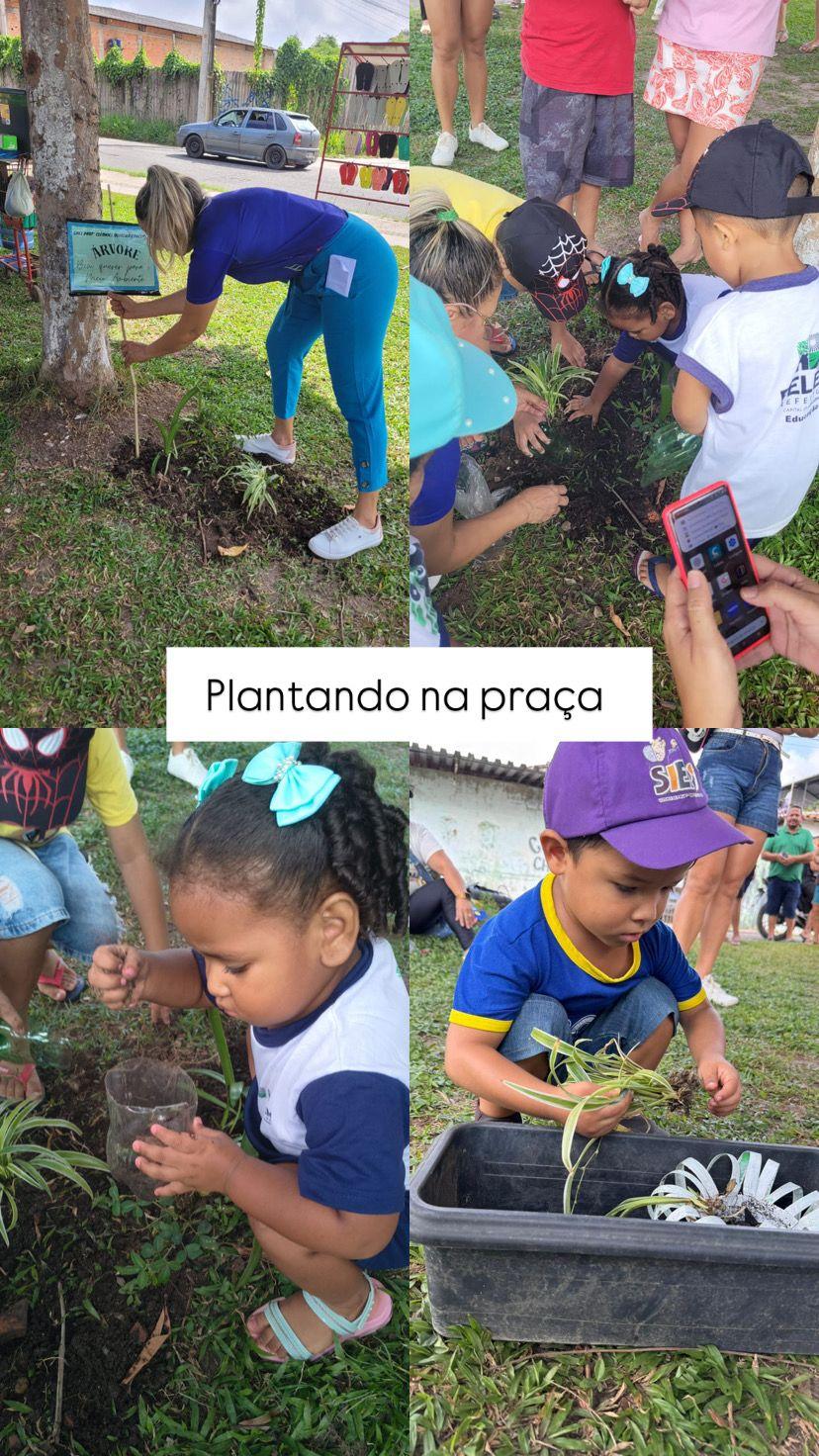 Também foi realizada a plantação de duas mudas de árvores, doadas pelas famílias e plantadas com a ajuda das crianças. Para encerrar a ação, compartilhamos um piquenique coletivo à sombra das árvores, utilizando os tapetes ecológicos feitos de caixas de papelão decoradas, e destinamos corretamente os resíduos produzidos em nossas ecolixeiras confeccionadas a partir de garrafões de água mineral reutilizados.